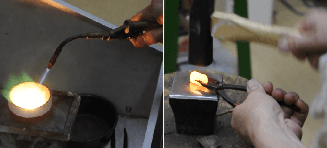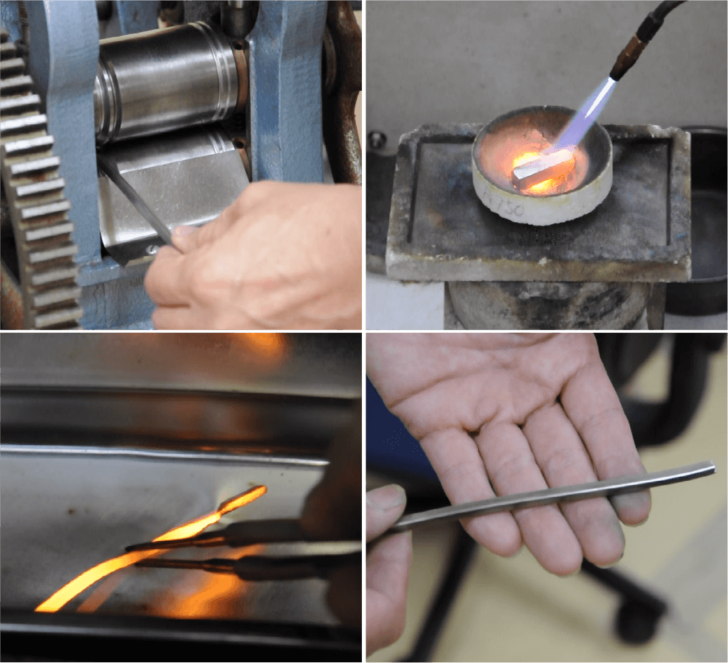 高温バナーで熱を入れて柔らかくし、地金が真っ赤なうちに叩いて鍛え上げます。繰り返し叩くことで地金内の分子構造が均一になり、硬さがより増していきます。この工程を「焼きなまし」といい、何度も繰り返しながら角棒状に成形していきます。