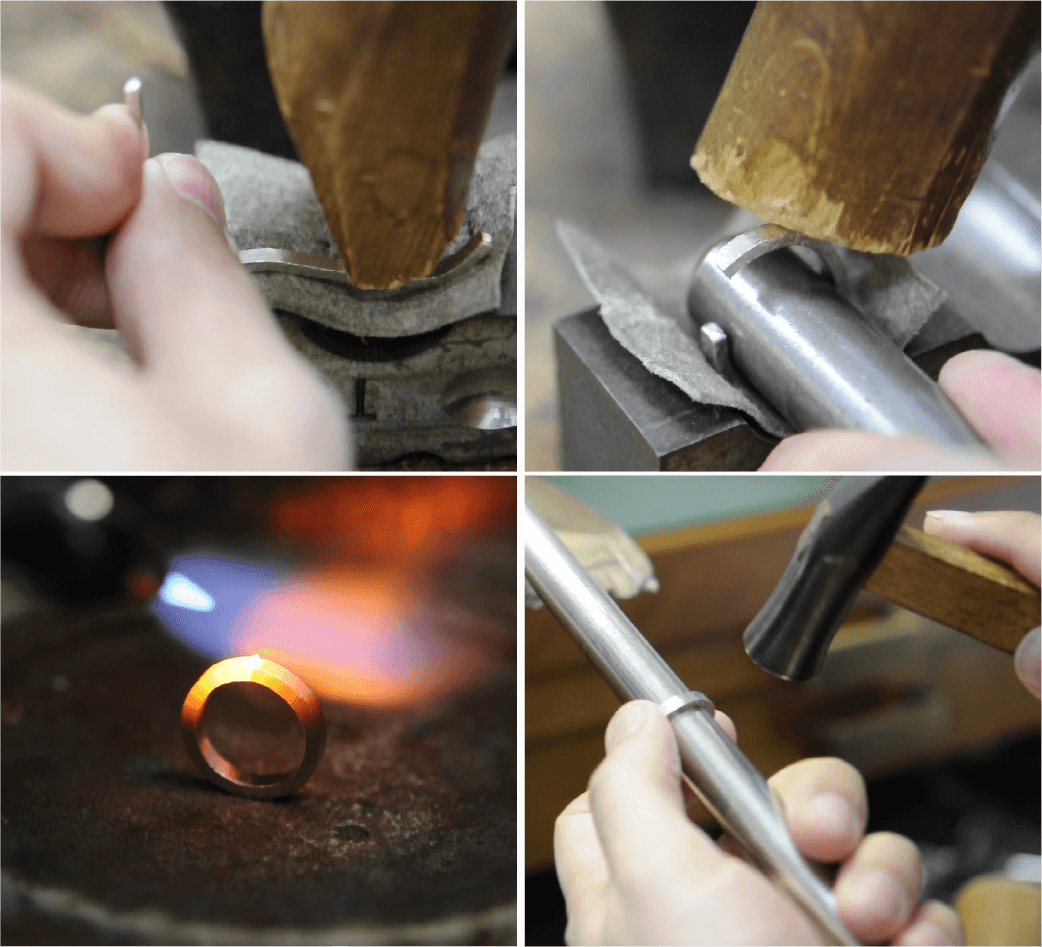 角棒を木槌などで叩きながら曲げていきます。サイズ棒に合わせ巻きつけ、ロウ付けと呼ぶ溶接によってリング状に成形します。鍛造製法では「焼きなまし」や叩き上げる「圧縮」を何度も繰り返すことで金属の密度があがり、硬く強い指輪になります。