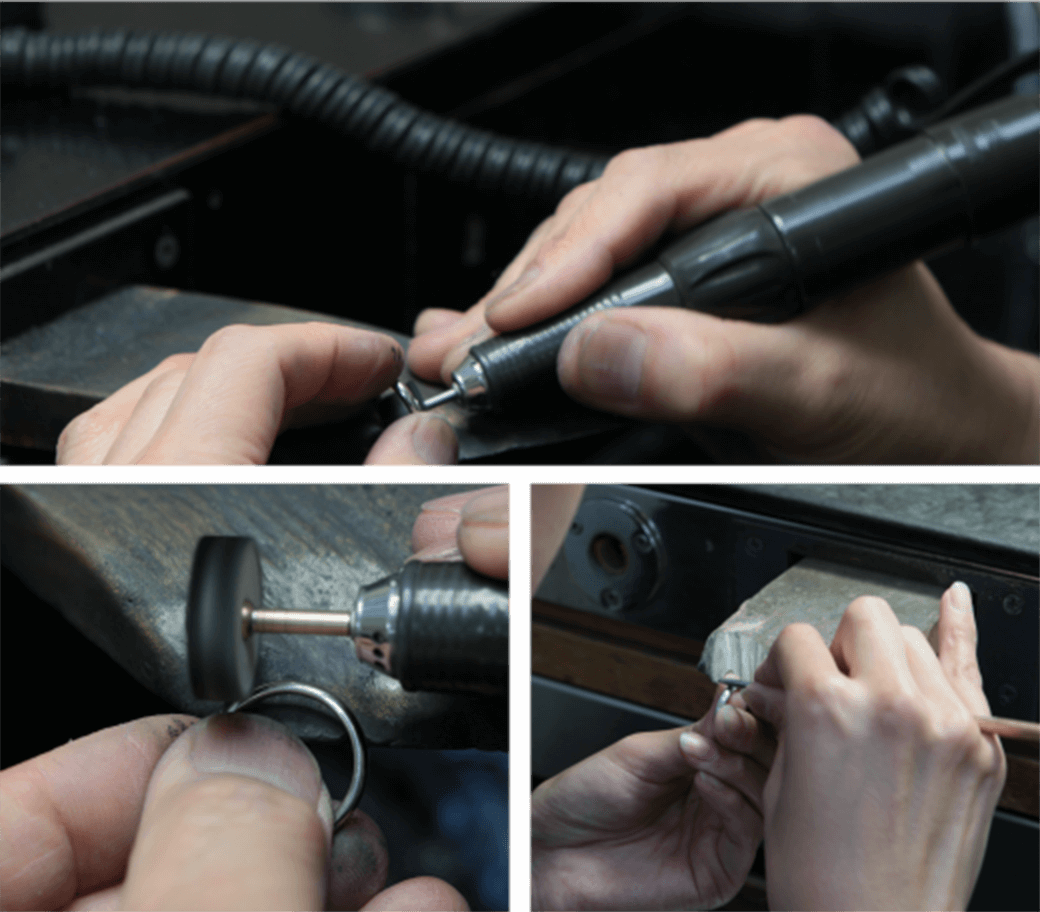リングの仕上げでは、内側と外側でそれぞれ役割が異なります。内甲仕上げでは、指馴染みがよくなるよう、専用の工具や ヤスリなどで磨いていきます。外側は、バフ研磨で磨きだします。モーターにつけたバフ布に研磨剤をつけ、高速回転させることでジュエリー表面を美しく磨きあげます。バフ布の使い分けは感覚的な部分が大きく、まさに職人技が冴える部分です。バフ磨き以外にも、「ヘラがけ」と呼ばれる工程も重要です。ヘラがけすることで表面が硬化して傷が付きにくくなり、硬さが増すことで輝きがさらに強くなります。