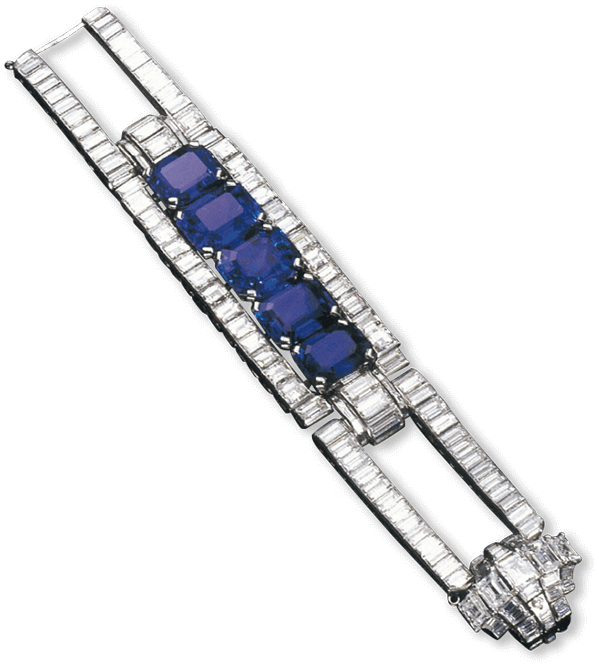 プラチナにダイヤモンド、サファイアを組み合わせたブレスレット。厳密な幾何学的ラインとクールな色彩感。アール・デコ・スタイルのジュエリーでは、プラチナがそのモダンなデザインを一層強調する。ヴァン・クリーフ&アーペル製。エレーヌボーモン夫人旧蔵、サザビーズ・ジュネーブのオークションより(写真:サザビーズ)。