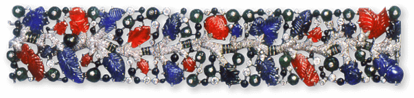 プラチナ製ブレスレット。木の葉模様を彫刻したルビー、中央にブリリアント・カットのダイヤモンドを象眼した球形のサファイヤとエメラルド。葉脈はブリリアント・カット・ダイヤモンドのパヴェ。1930年頃、カルティエ製。