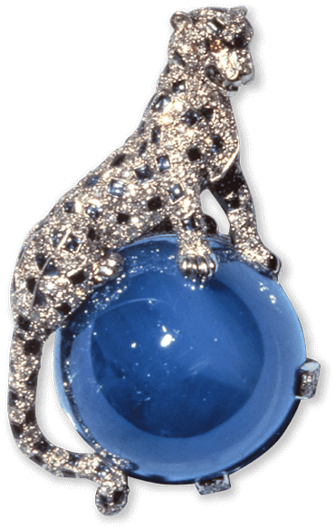 シンプソン夫人のシンボルともいえるパンテール・ブローチ。152.35カラットのカシミール産サファイアに乗るパンテールは、まるで豹が手鞠にじゃれかかるかのよう。1949年、カルティエ製(写真:カルティエ ジャパン)。