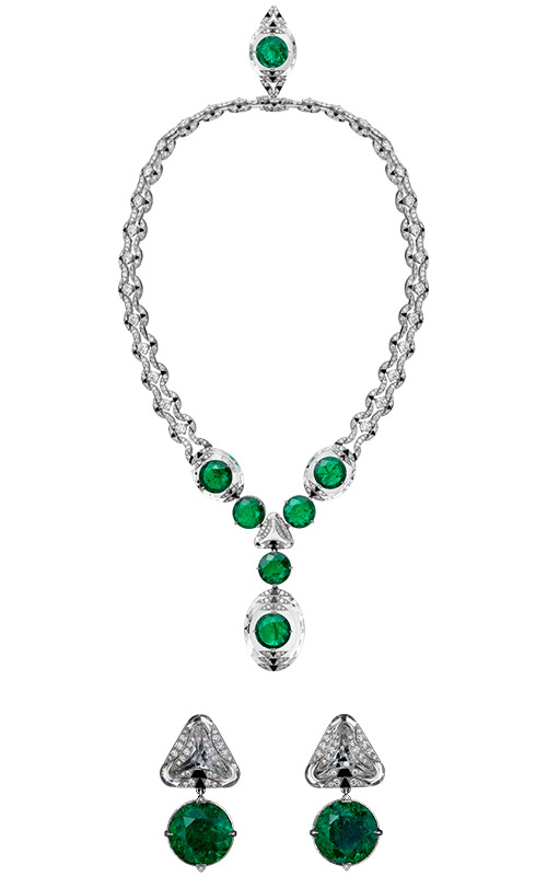 胸元に主張するネックレスは、エメラルド、ロック・クリスタル、オニキス、ダイヤモンドなどをプラチナ・セッティングしたもの!