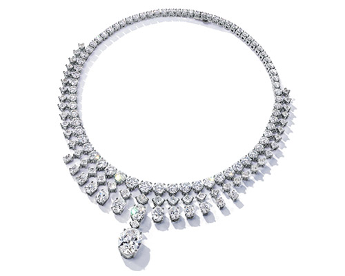11カラット超のオーバル・ダイヤモンドと、様々なカットのダイヤモンド(計65カラット超)を用いたネックレスは、お値段2億円以上!