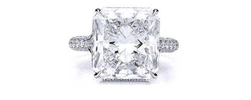 左手にはめているリングは、9カラット超の長方形のダイヤモンドをプラチナ・セッティングしたもの。