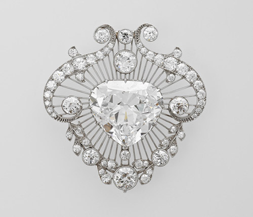 1911年、エリザベス女王の祖母であるメアリー女王のためにイギリスの宝石商であるガラード社が製作したもので、18.8カラットのハート形のカリナンVダイヤモンドがデザインの中心になっています。これまで発見された中で最大のダイヤモンドである3,106.75カラットのカリナンを105個に分けたうちの一つが、このカリナンVです。