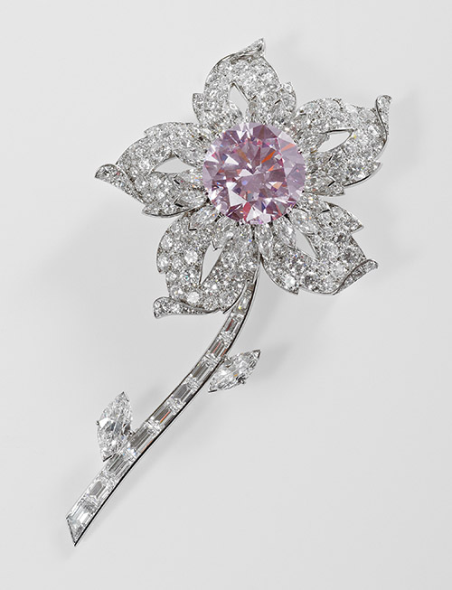 このピンクダイヤモンドは1953年、ロンドンのカルティエによりプラチナとホワイトダイヤモンドの花のデザインのブローチにセッティングされました。全長4cmほどのブローチにはさまざまな形状のダイヤモンドがあしらわれ、プラチナが花びらを縁どっていることで自然な美しさを醸し出しています。