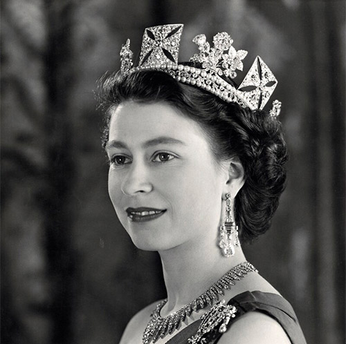 エリザベス2世は、カルティエによって1929年に製作されたこの華やかなプラチナとダイヤモンド製のイヤリングを統治初期に愛用しました。母后のエリザベス王妃は以前多くのジュエリーをイギリス人相続人のマーガレット・グレヴィルから贈られており、その中からエリザベス王女(当時)の結婚祝いとして父ジョージ5世と母エリザベス王妃から贈られました。