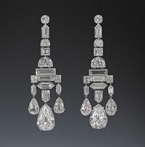 グレヴィル・シャンデリア・イヤリングは、典型的なアールデコのデザインの粋を極めています。アールデコの時代は新しいカッティングが生まれており、ダイヤモンドに様々なファンシーシェイプが可能となりました。この9㎝に満たないイヤリングにはハーフムーン、トラぺゾイド、スクエア、バゲット、バトン、そしてエメラルド型にカットされたダイヤモンドが使われています。