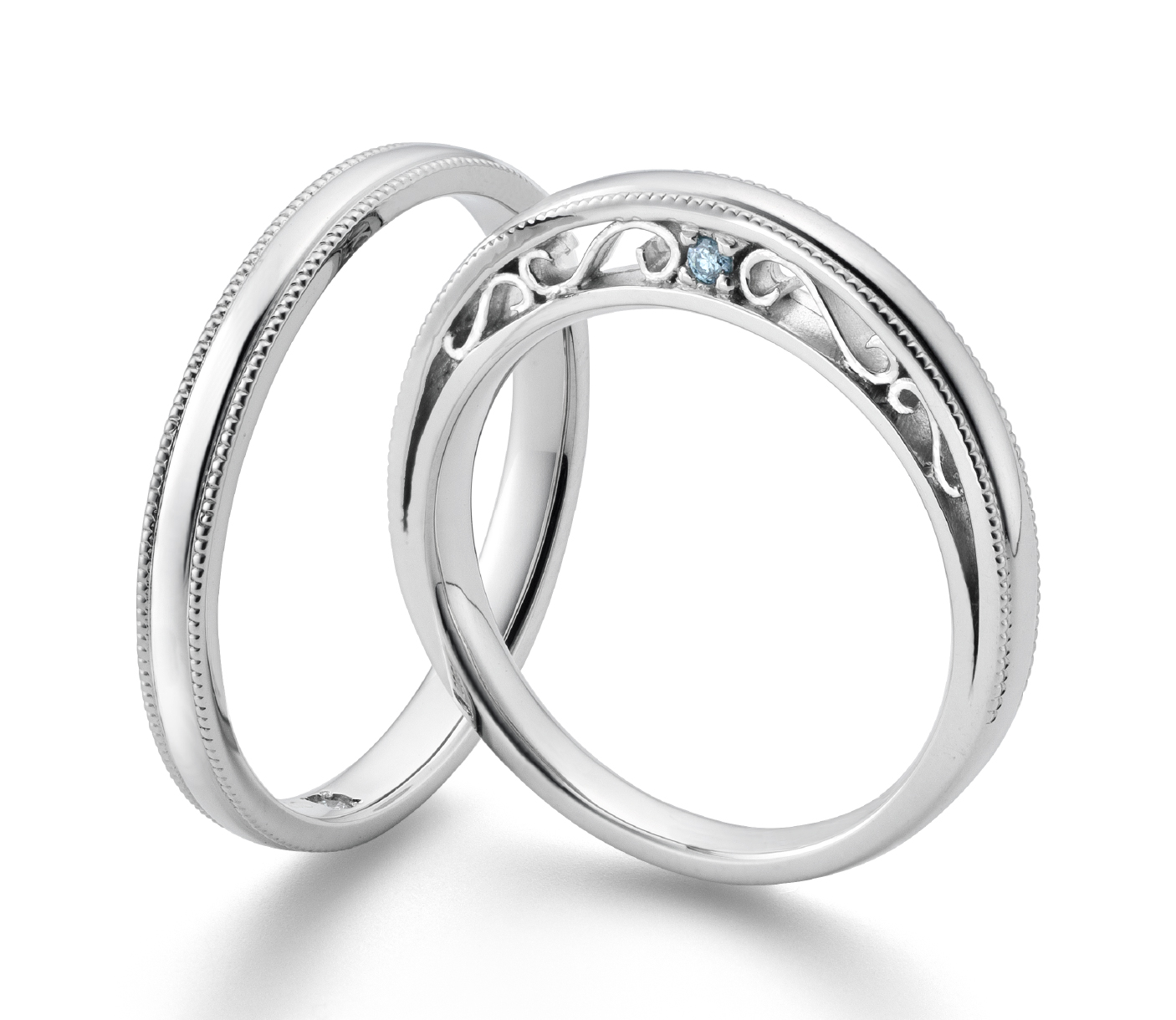 【Blue Wedding ブルーウェディング】幸せを呼びこむブルーダイヤと、ふたりの絆を象徴するツインズダイヤ。2つのダイヤを対にしてサイドに留めた、遊び心のあるデザインです。