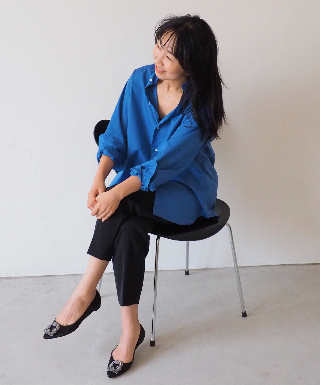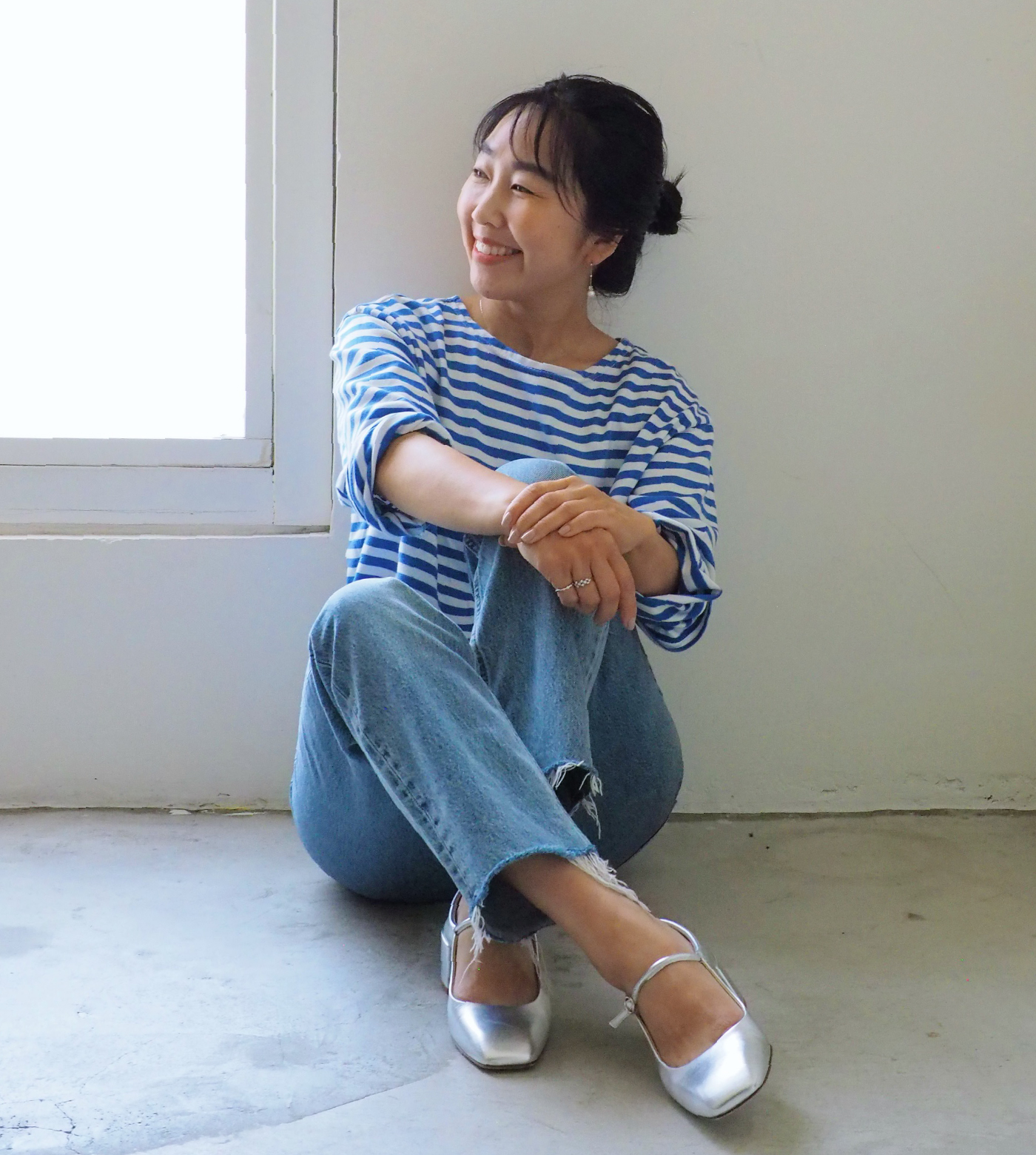 毎日着ているわけではないけれど、ボーダー×デニムは自分にとって原点と言えるスタイリング。ジュエリーは長く付き合っていくものを選びたいからこそ、こういった原点スタイルに似合うものを見つけたいと常に思っています。シルバーではなくプラチナを合わせてみると、カジュアル感がぐっと格上げされる感覚があり、今の年齢にとてもマッチしました。パールは好きなので様々なデザインを持っていますが、プラチナの輝く揺れとのバランスは大人の遊び心を感じます。