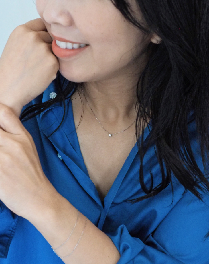 可愛いアイテムから出るかわいらしさより、ハンサムなアイテムの中に香る女っぽさが好き。だからこういうマニッシュなアイテムは少しオーバーサイズを選んだり、キラッと光るジュエリーを合わせるのが定番です。普段はボリュームあるジュエリーが多いのですが、華奢なジュエリーが持つエネルギーや輝きは、相反するマニッシュなスタイリングの中で一層引き立つ気がしました。首元と腕の控えめな輝きと揺れが、定番スタイルをさらにブラッシュアップしてくれます。