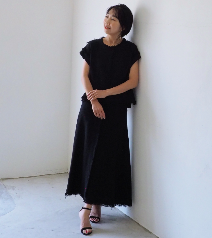 きちんとした印象のツイードセットアップは、ジュエリーで遊び心を足すとデイリーな着こなしに。揺れるピアスのように、自分にとってちょっとだけ冒険のアイテムを選ぶ時は、着慣れたブラックスタイリングから試してみると、バランス感の軸が分かりやすいと思います。