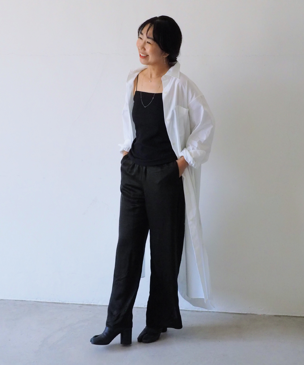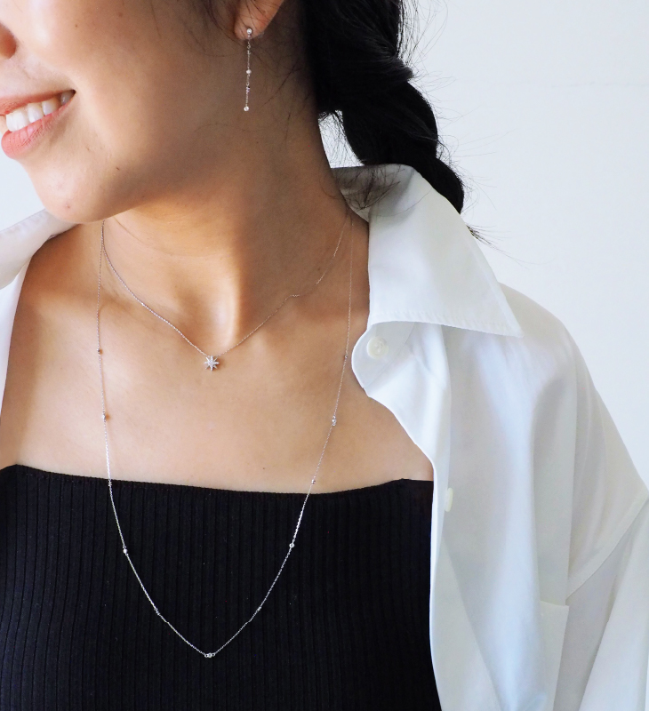 暑くなるにつれキャミソールと涼しげなシルクパンツのようなリラックスムード高まるアイテムに頼りがち。そこでワンマイルスタイルのようにカジュアルになりすぎないよう、プラチナの輝きとパリッと美しいシャツワンピースをプラス。一気にお出かけ感が高まります。ピアスの星の煌めきが、つけてみると手に取った時よりも存在感を感じ、目に入るたび嬉しくなりました。