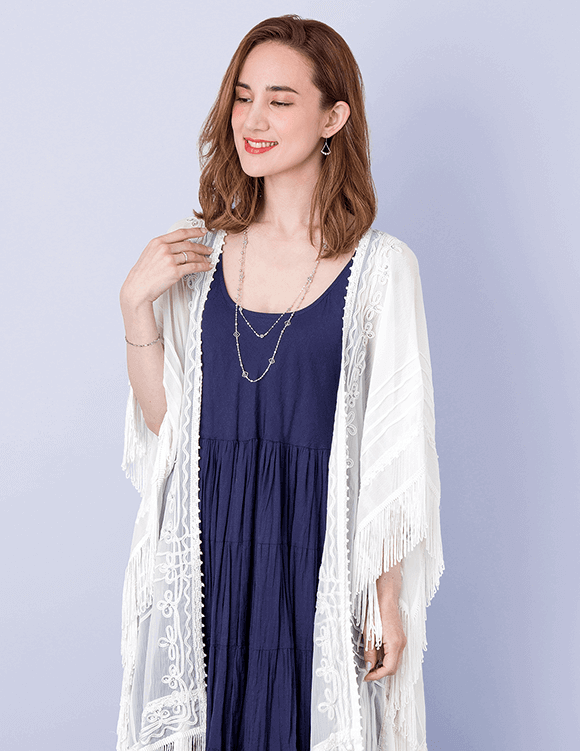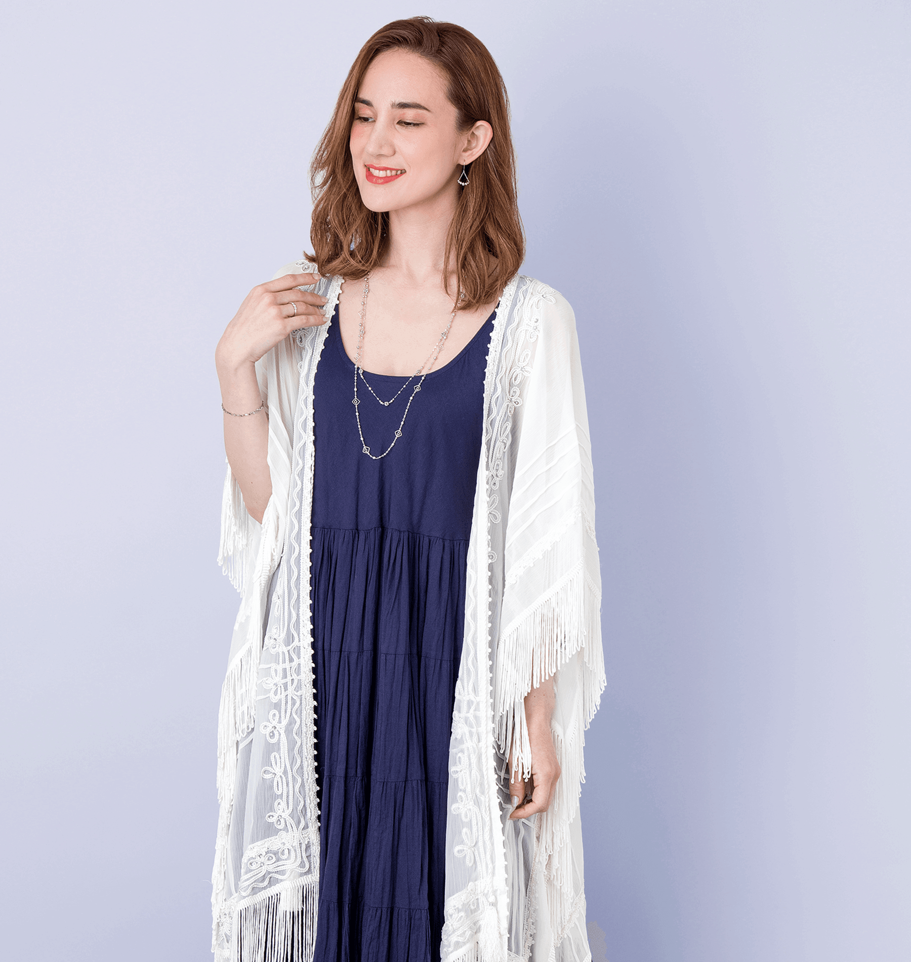 「刺繍、フリンジ、スパンコール」と、サッと羽織るものにも