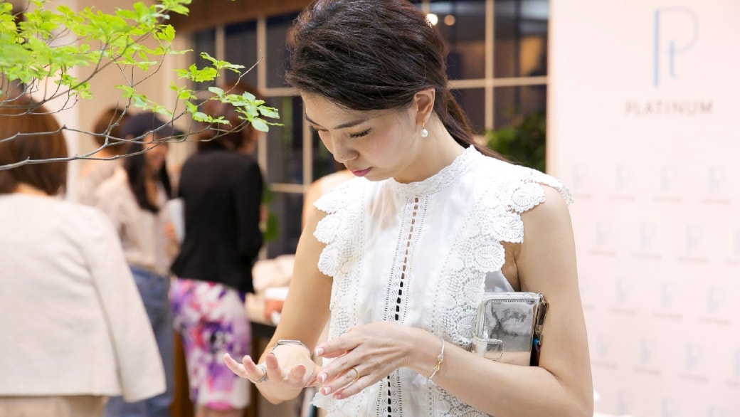 インフルエンサーの方々が展示されているプラチナ・ジュエリーの中から、実際手に取って、つけてみたいジュエリーをどんどん選んでいきます。