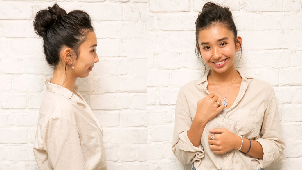 「大振りなドロップ型のダイヤモンドペンダントでカジュアルをクラスアップしました。普段なかなかつける機会のない華やかなプラチナ・ジュエリーも、意外とカジュアルにも合うんだな、と新発見。リングやピアスなどたくさんつけても、さらりとかっこよく決まるのがプラチナの魅力ですね。ヘアスタイルは普段からアップスタイルが多いのですが、後ろを編み込みにしたユニークなまとめ髪も、カジュアルをアップデートしてくれてよかったです」(鈴木さん)