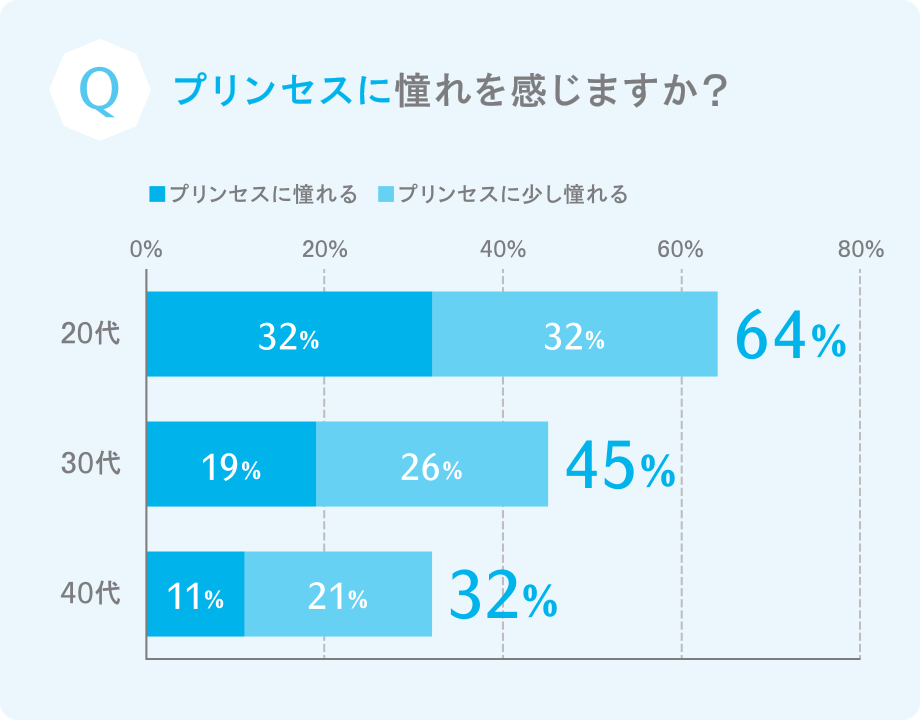 プリンセスに憧れたことがあるかを聞いたところ、20代では64%もの女性が「憧れる(憧れがあった)」と回答。30代では45%、40代では32%でした。