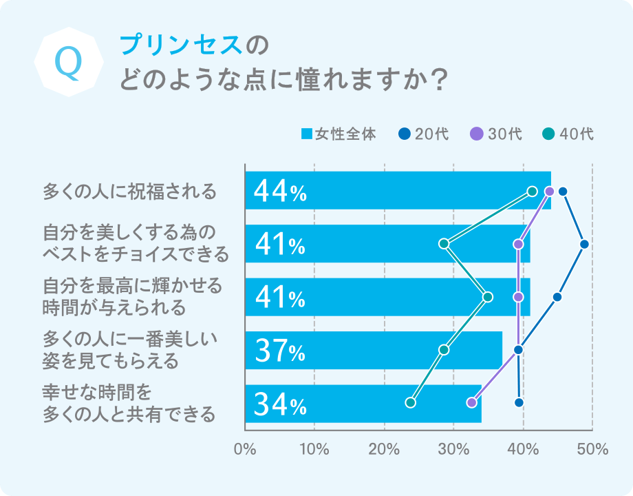 これらの結果から、各世代で多くの人に祝福され、輝かしく美しいプリンセスへの憧れを窺い知ることができました。
