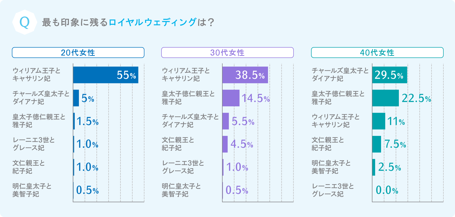 最も印象に残る結婚式では、全体では英国王室のウィリアム王子とキャサリン妃の結婚式との回答が最も多く、チャールズ皇太子とダイアナ妃、皇太子徳仁親王と雅子妃、文仁親王と紀子妃(秋篠宮ご夫妻)が続くものの、各世代で印象に残るロイヤルウェディングが異なる結果となりました。