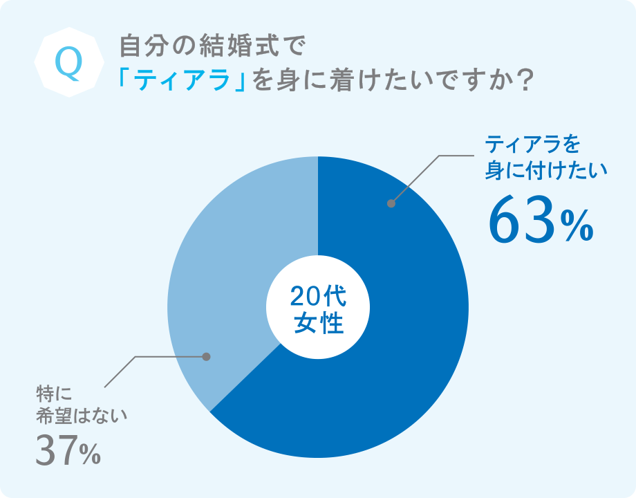 多くの人に祝福されるプリンセスと、そうありたいと自身の姿を重ねる女性たち。プリンセスを象徴する「ティアラ」を自身の結婚式でつけてみたい(つけた)という人は、20代ではでは6割を超えました。30代では46%、40代では41%と、ティアラへの憧れがあることがわかりました。