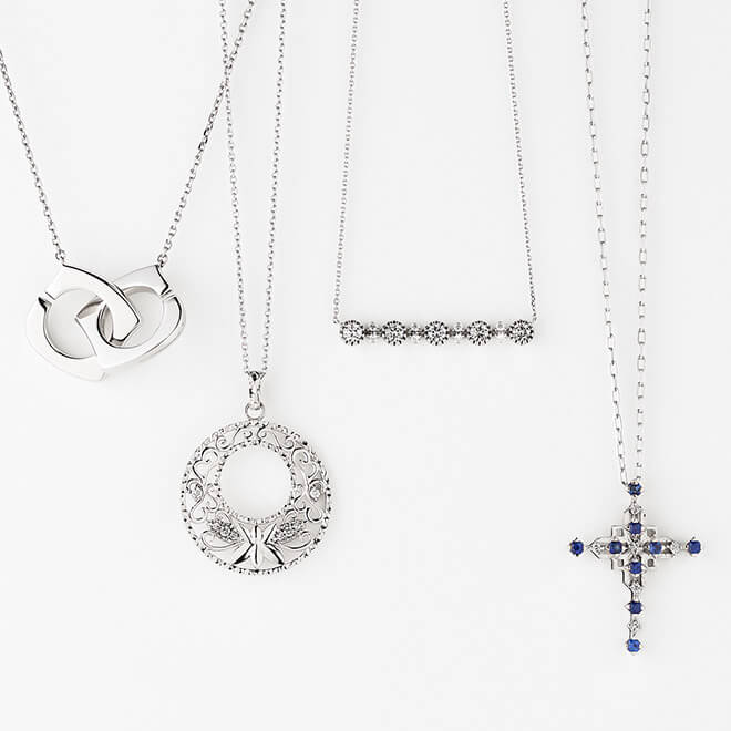 徐々に薄着に向かうこれからのシーズン、インパクトのあるデザインや、表情豊かなテクスチャーで表現した透かしのデザイン、宝石を散りばめたペンダントがコーディネートを格上げするアイテムとして重宝します。ボリューミーでありながら、エレガントさを演出できるのは生まれながらに白く、希少なプラチナならでは。