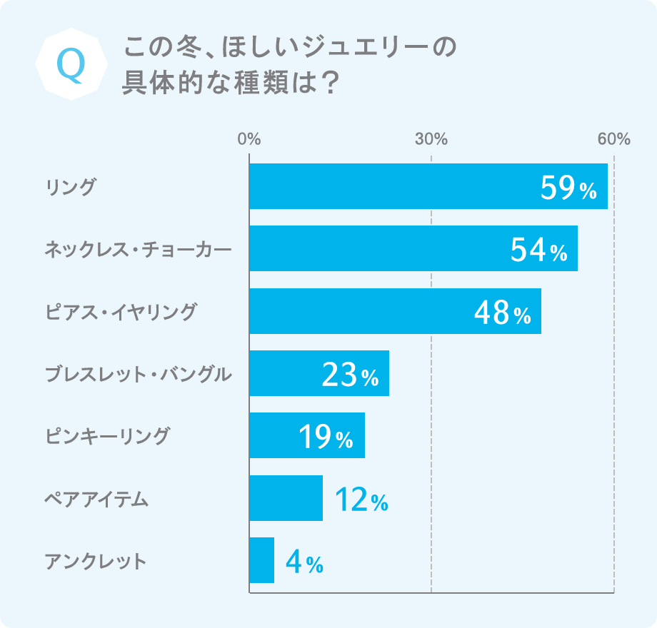 「この冬、ほしいジュエリー」についてきくと、具体的な種類としては、1位「リング」(59%)、2位「ネックレス・チョーカー」(54%)、3位「ピアス・イヤリング」(48%)となりました。