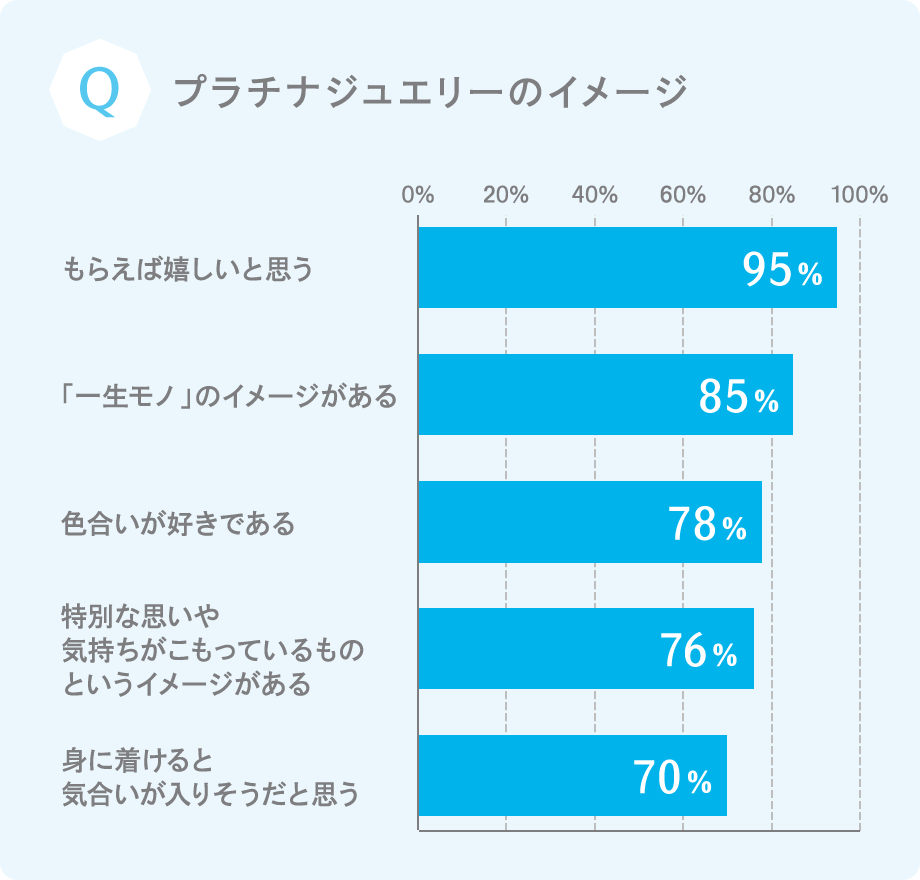 また、トレンドに左右されず長くて愛用できる貴金属の代表格としての「プラチナ」ジュエリーについても質問をしました。その結果、95%の人が「もらえれば嬉しい」と回答。また、プラチナは日常生活で変質・変色せずその輝きが変わらない特性があるだけに、約9割(85%)が「一生モノ」のイメージがあると回答しています。